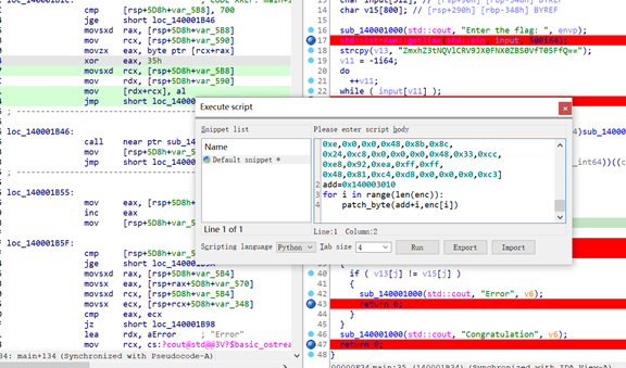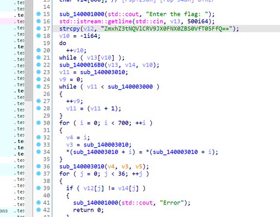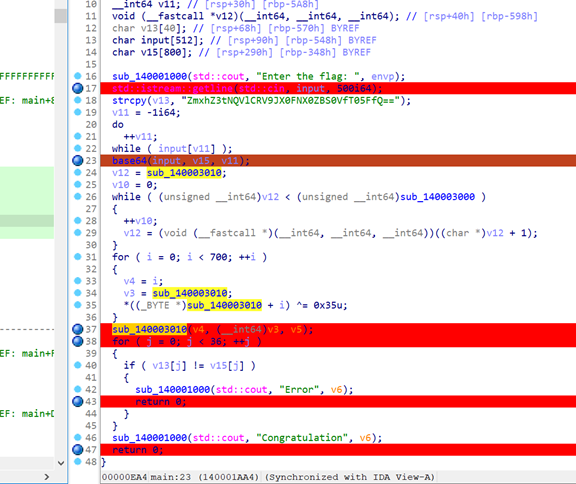 分析代码有个base64,但是是个假的flag,smc是异或去解密sub_140003010是异或0x35